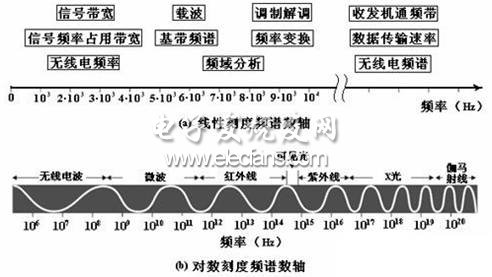 1、线性标度:此时为一有原点的射线数轴。射线数轴的原点对应于频率为“0”的直流电,射线数轴的方向指向频率增大方向。线性标度的电磁频谱图的概念非常清晰,但其表示频率范围的能力有限。如图1中(a)图所示。