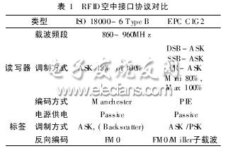 当前超高频RFID 空中接口协议主要是ISO18000- 6 TYPE B 协议和EPCG loba l C lass1 GEN2协议( EPC C1GEN2协议, 现已经成为ISO 18000- 6TYPE C )。两种协议的对比如表1 所示。总体来讲, EPC C1GEN2空中接口协议定义更完备, 现有的产品大多遵循此类协议。另外, ISO 18000- 6 基本上是整合了一些现有RFID 厂商的产品规格和EAN- UCC所提出的标签架构要求而订出的规范。它只规定了空中接口协议, 对数据内容和数据结构无限制, 因此可用于EPC。所以EPC 协议得到广泛的应用, 成为事实标准。