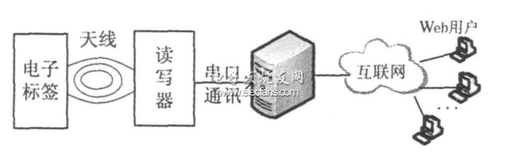 系统由电子标签、读写器、串口通讯、服务器和用户终端五部分组成。如图1所示。读写器是系统的核心,其通过射频信号与IC卡(电子标签)通信,完成读卡、存储和发送数据的工作,其可以独立工作,也可联网工作,文中采用RS232串口通信与服务器相连。