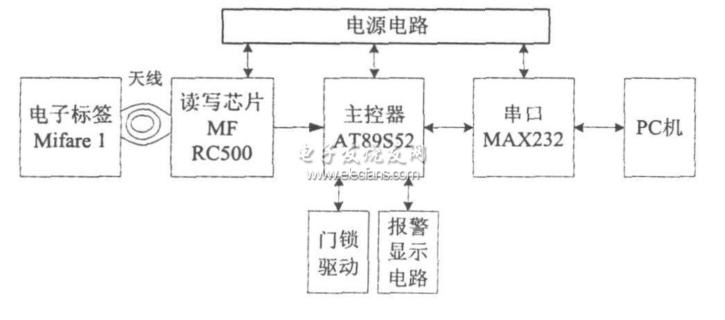 主控器由AT89S52单片机及其外围电路组成,负责控制读写模块、与PC机间的串口通信和对外部设备的控制操作。其中单片机对读写模块的操作就是通过控制MFRC500来实现对Mifare1卡的操作。