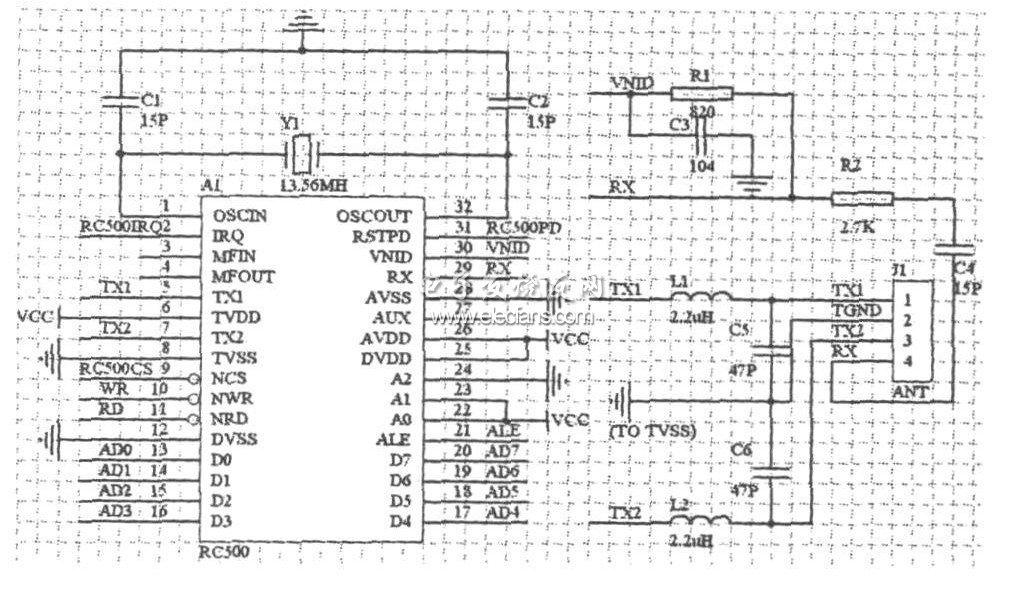 单片机对读写芯片采用中断控制方式,中断控制口INT0与MFRC500的IRQ脚相连。MFRC500内部有64个寄存器,单片机通过往寄存器里写入控制命令来对其进行配置和操作,其中掉电检测引脚RSTPD连接单片机P2.0脚,NCS脚连接P2.7脚,NWR、NRD分别连接至单片机读写端口WR、RD脚,数据口D0~D7连接至单片机P0口石英晶体振荡器产生13.56MHz的工作频率,L1、L2、C5、C6构成的低通滤波器用于抑制晶振电路同时产生的高次谐波。接收电路由R1、R2、C3、C4组成,采用MFRC500内部产生的VNID电势作为RX脚的输入电势,为了减少干扰,VIND脚连接一电容C3到地,且必须在RX和VNID之间连接一个分压器(R1),最好还在天线线圈和反压器之间串连一个电容(C4)。为了获得更好的性能,在电路板布线时,这些元件应紧靠MFRC500芯片天线引脚RX、TX1、TX2。