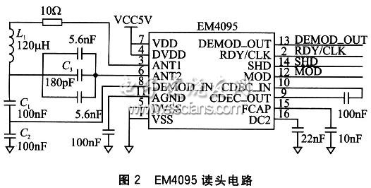 EM4095是RFID基站读写芯片,载波工作频率为100~150 kHz,可以对EM400X、EM4050、EM4150等标签进行操作。采用图2所示工作电路时,其工作频率由以下关系式确定: