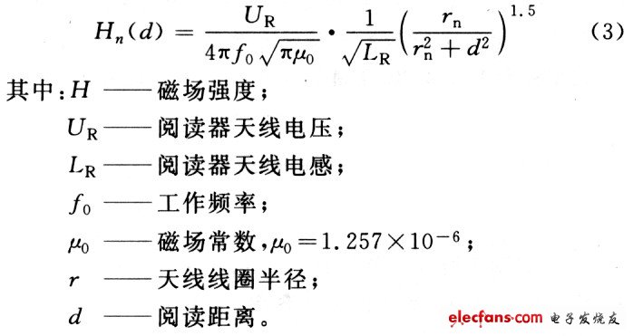 耦合因子仅仅与线圈排列的机械尺寸(如线圈直径、阅读距离、线圈方位角)和磁场中线圈附近的物质有关,与阅读器天线或应答器天线的电感无关。为了提高耦合因子,应该选择尽量小的传输距离,而且阅读器和应答器的天线轴线要平行。如果阅读距离确定,阅读器天线线圈直径和磁场耦合因子k就可以根据这个特定距离进行优化设计。磁场强度可以由式(3)来计算: