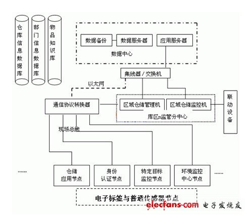 本文所设计的仓储监管系统采用三层结构模式,主要由数据中心、区域(本地)仓储管理机、区域监控机、信息汇集节点、电子标签与普通传感器节点等部分组成。