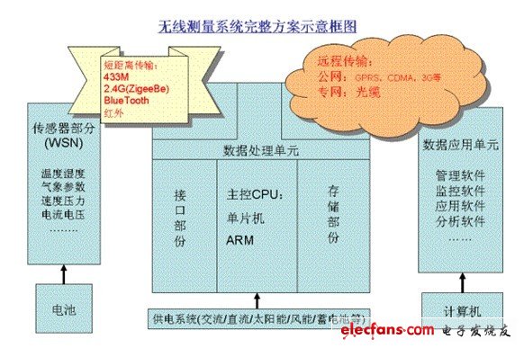 传感器部分就是WSN---无线传感器,可以根据现场需求进行选择使用;而数据应用部分实际上就是软件系统,可根据应用的需要进行分类设计;核心的部分是数据处理单元,可根据应用需要选择单片机或ARM系统。