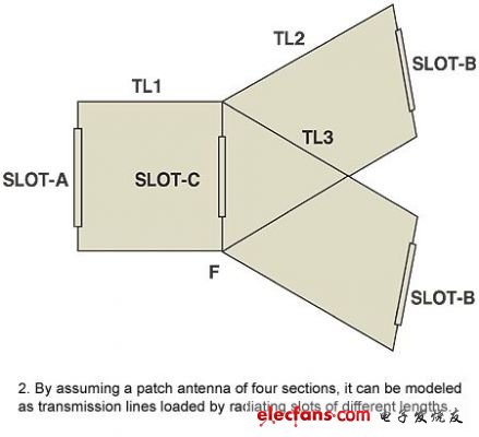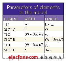 假设贴片天线可分成四个区域,那么可将它建模成一系列带有不同长度辐射槽的传输线(图2),表中列举了这三个传输线的参数(宽度和长度)和这三个辐射槽的宽度和长度。