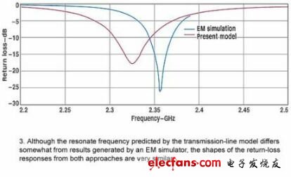 根据早期提出的方法,对一个具有εr=2.42、h=0.127cm、w=4.04cm、L=5.94cm和y0=0.99cm参数的贴片天线进行了分析。图3显示了采用这里所提到的传输线模型方法所得到的结果,并将它与采用商用计算机辅助工程电磁(EM)仿真器得到的数据进行了比较。即使谐振频率有点漂移,传输线模型还是能非常接近地跟踪EM仿真器预测的回波损耗曲线。谐振频率上的这个微小漂移,是由于没有考虑嵌入馈线与贴片之间的不连续性而导致的。