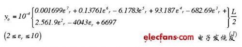在各种εr (2 ≤εr ≤10)值下利用传输线模型对贴片进行参数研究。图4表明了在边缘(y0=0)处,由微带线馈电的矩形微带贴片天线具有更高的输入阻抗,对于不同的εr值,其变化大约从150到450Ω。另外从中也可以观察到,与同轴探针馈电的贴片天线相比,当嵌入位置从贴片边缘向中心移动时,输入阻抗迅速下降。这些参数的研究已被用来推导如式(1)的曲线拟合公式,以便确定精确的嵌入长度,从而为通常使用的薄介电基板上实现50Ω输入阻抗。
