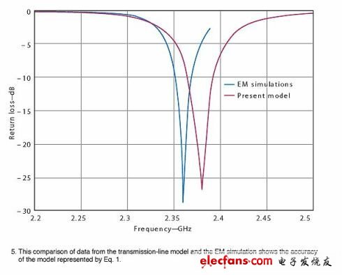 用εr=5.0、h=0.127cm、W=4.1325cm、L=2.8106cm、y0=0.9009cm的贴片天线对该公式的精确性已进行了验证。为确认公式的有效性,采用EM仿真器对贴片进行分析。图5给出了由传输线模型产生的结果与EM仿真器预测结果之间的对比。尽管在这两组数据中谐振频率有1%的偏移,但用这两种方法预测的回波损耗曲线还是具有很明显的紧密一致性。