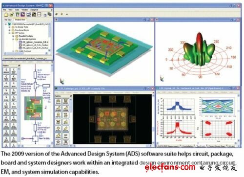 作为电磁软件工具集成度提高的象征,安捷伦科技公司推出的2009版本的高级设计系统(ADS)软件有助于电路、封装、电路板和系统设计师采用单一软件平台工作(见图)。除了包含最新蜂窝和无线标准(包括LTE和WiMAX)方面的众多元件模型外,这个软件套件通过对数千兆位高速串行链路的快速眼图优化而支持信号完整性研究,其中版图几何尺寸、预加重和量化专门针对最低误码率(BER)作了优化。