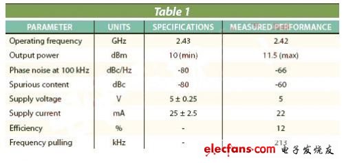 采用安捷伦科技公司的先进设计系统(ADS)设计软件工具,对包括了馈线和振荡电路的天线特性进行仿真和分析。10应该指出的是,采用 Momentum软件包对天线进行建模,该软件已包括在ADS内。利用在GaAs MESFET有源器件的漏引脚插入一个电容器对振荡频率进行精细调节和控制,从而满足设计目标(见下表)。据观测,所获得的振荡频率范围偏离2.45 GHz中心频率的最大处约6.87%,具有低相位噪声和可接受的输出功率。