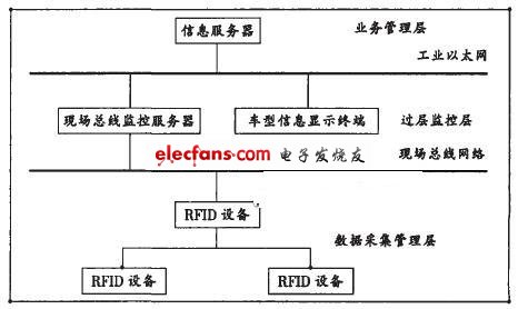 ( 2) 生产过程监控层。生产过程监控层负责管理生产过程中在制品的加工信息和生产线的状态信息, 并将这些实时信息及时呈递给生产管理部门, 使企业领导和生产管理人员能够掌握第一手的生产作业情况。同时, 管理部门可以根据这些信息对生产进行控制, 及时调整生产作业计划和修改生产控制参数, 以求在最短的时间内, 使生产流程重新步入正常工作状态, 确保生产计划能够顺利完成。生产过程监控层包括现场总线监控服务器、RFID 车辆识别终端、车型信息显示终端, 通过工业以太网组成一个星型网络结构。