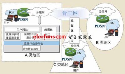 单点系统的组网结构存在两个不同类型的地区,位于A类地区用户相当于本地用户,用户接入后可以通过本地的分组网直接接入到本地的流媒体业务平台使用流媒体服务;B类地区的用户在接入本地的分组网后还需要通过骨干网连接到远端的流媒体业务平台。