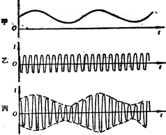 下图是调幅装置的示意图.接在振荡器和线圈之间的话筒就是一个最简单的调制器,由声源发出的声音振动使话筒里的碳粒发生时松时紧的变化,它的电阻也发生时大时小的变化。所以,虽然振荡器产生的是高频等幅振荡电流,但是线圈通过的却是随声音而改变的高频调幅电流.由于线圈的互感作用,从开放电路中发射的也是这种高频调幅电流。这种电磁波叫调幅波。