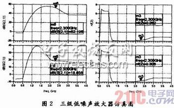 该项目中采用的方案是三级低噪声放大器级联。第一级选用HMC618LP3,在25℃环境中2.3GHz处增益为15dB,噪声系数为1.05。第二级选用HMC548LP3,在25℃环境中2.3GHz处增益为25dB,噪声系数为1.5。第三级选用变增益放大器HMC287MS8,在25℃环境中Vctl=0时,2.3GHz处增益为23dB,Vctl=3V时,增益为-11dB。将放大器的S2P文件导入ADS软件中仿真,结果如图2所示。由图可知,最高增益为52.196dB,最低增益为18.658dB。三级放大器增益都很高,如果各级间匹配不好,很可能会导致放大器自激振荡,要从源头解决这个问题,只有修改各级的匹配网络,这往往难度很大,最有效的办法是在级间增加π型衰减网络。π型衰减网络可以有效抑制信号在放大器级间的反射,nf(2)是π型网络引入的噪声,在实际电路中可以更换π型网络电阻调节衰减量和噪声系数。