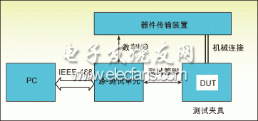 我们的第一个例子包括测试仪器、器件传递装置(handler)和PC(图1),这里需要注意如何通过内部编程来消除大多数的GPIB通讯来加速测试。