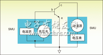 图2:在三极管测试中一般使用两台SMU,第一台在HBT基极和发射极之间,第二台在发射极和集电极之间。