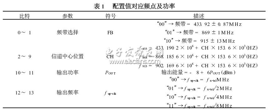 CFG_DATA位速率不能超过1Mbps。一旦配置完,设备状态由外部信号TXEN,PWR_DWN,STBY和DATA(DATA在发射模式为输入脚,在接收模式为输出脚)来设定。配置可以在除了待机和掉电以外的所有模式中完成。在掉电和待机模式工作后,寄存器内容仍然有效。配置数据只有当电源撤除后才会丢失。如果不进行配制,模块在默认模式下,工作频率为868.1856MHz,按最大功率输出,CLK_OUT为1.3284MHz。该特性使微控制器的软件调试变得简单、方便。配置中的1~2位为频段选择,3~10位为频点选择,11~12为输出功率设置,13~14为时钟分频输出设置,如表1所示。