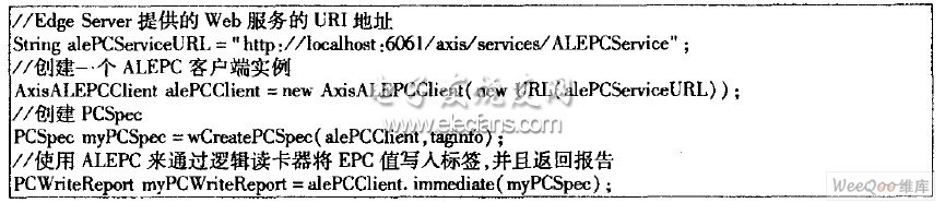 系统中除了标签和读卡器上运行的软件外,介于读卡器与应用程序之间的中间件是其中的一个重要组成部分。本系统采用BEA RFID Edge Server中间件。其主要任务是对读卡器读取的标签数据进行过滤、汇集和计算,减少从读卡器传往应用程序的数据量,它定期轮询读卡器,删除复本,并进行筛选和设备管理,负责创建ALE事件并将其分派至应用程序。