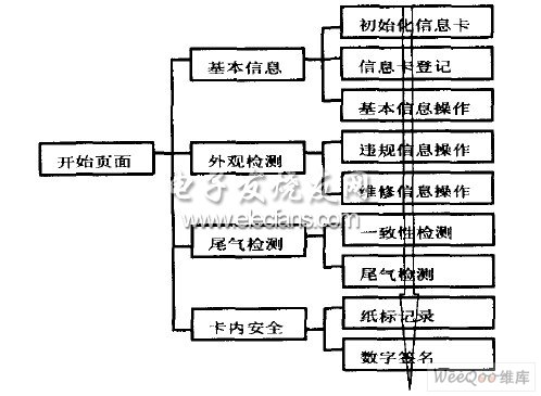 系统主要包括环保信息卡基本信息维护、机动车外观检测、汽车尾气检测和安全模块四个模块,图给出了整个系统的组成和逻辑操作流程。
