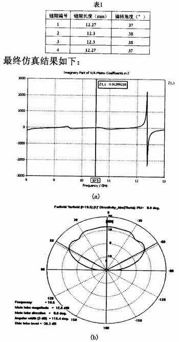 为简化设计起见,本设计采用波导宽壁斜缝谐振阵的方式,切割的缝隙数为4个,达到了指标要求的效果。