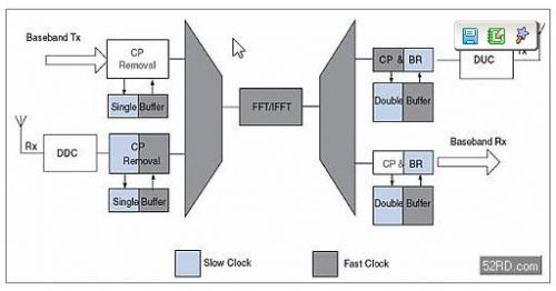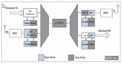 图5描述的是FDD系统下FFT复用的一种可能配置。数据发送和接收通道的操作类似于TDD系统,其区别在于这些操作是同时进行的。因此,pre-FFT数据必须被缓存且把频率提高到快时钟频率。用一个单缓冲器就足以改变速率,因为缓冲器的写时钟频率总是低于或等于读时钟频率。