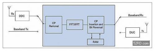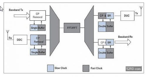 FFT与FFT反变换:在OFDM调制中最关键的运算就是IFFT,相类似,OFDM解调的核心为FFT。宽带系统中的高FFT吞吐率是至关重要的,尤其是在FFT被多路数据通道共享时。