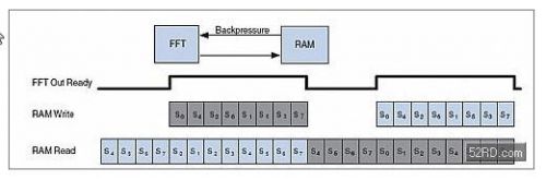 对于固定的FFT size,由于读时钟频率并不比写时钟慢,用一个单缓冲器就够了。但如果FFT size是变化的,一个单缓冲器恐怕就不够了。举个特殊的例子,假设两个时钟工作在同一频率。在这种情况下,当新的数据被写入内存,上一个数据包中的数据会从同一个存储地址被读出。如果上一个数据包的FFT/IFFT size更大,那么当前包的写操作会早在上一个数据包读操作完成前结束。这样的话,为了阻止写入过多的数据,就必须延迟上行数据流模块的运行直到上一个大数据包的读操作完成。
