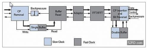 如前面所讨论,如果FFT为了资源共享采用不同速率的时钟,则需要pre-FFT数据缓冲器。在接收通道上,每当输入数据开始写入单缓冲器时,循环前缀移除模块开始记数。当整个数据包都被写入这个单缓冲器时,记数值开始从0地址被读出。