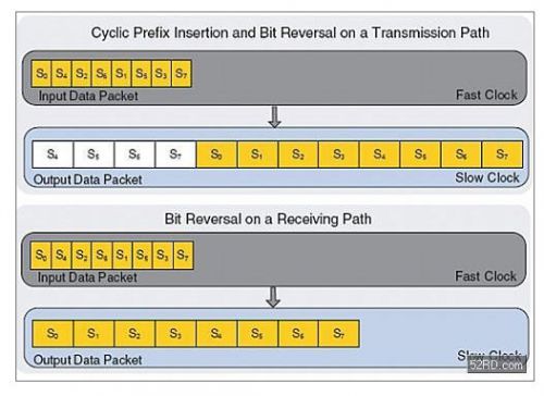 在发射数据通道上,CP移除子模快只是将输入数据按次序写入单缓冲器。同样的数据以不同的速率被读出。图9讲述了pre-FFT的数据操作。在接收通道上,数据通过天线进入OFDM解调器,其后通常还接有IF调制解调器。这样,接收模式下的pre-FFT模块不会再对上行数据流模块施加背压。对于TDD操作,在pre-FFT数据缓冲时,可以复用post-FFT双端口RAM实现位反转,因为这些操作在时间上是错开的。
