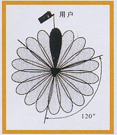 (1)波束转换智能天线波束转换智能天线具有有限数目的、固定的、预定义的方向图,它利用多个并行窄波束(15°~30°水平波束宽度)覆盖整个用户区,每个波束的指向是固定的,波束宽度也随天线元的数目而确定(见图2)。波束转换系统实现比较经济,与自适应天线相比结构简单,无需迭代,响应快、鲁棒性好。但预先设计好的工作模式有限,窄波束的特性将极大地影响系统性能。
