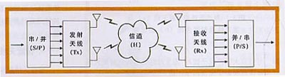 移动通信环境中存在多个散射体、反射体,在无线通信链路的发射与接收端存在多条传播路径,多径传播对通信的有效性与可靠性造成了严重的影响。研究表明,可以利用多径引起的接收信号的某些空间特性实现接收端的信号分离。多输入一多输出(MIMO)技术在通信链路两端均使用多个天线,发端将信源输出的串行码流转成多路并行子码流,分别通过不同的发射天线阵元同频、同时发送,接收方则利用多径引起的多个接收天线上信号的不相关性从混合信号中分离估计出原始子码流(见图4)这相当于频带资源重复利用,可以在原有的频带内实现高速率的信息传输,使频谱利用率和链路可靠性极大的提高。MIMO系统提供分集增益(diversitygain)和复用增益(multiplexinggain)。
