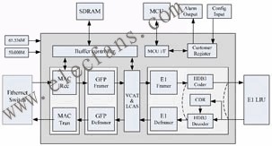 RAYCOM的EoPDH芯片族为广大设备制造商的转换器互通及业务质量保障提供了更加有竞争力的解决方案,芯片的功能框图如图1所示。同时,RAYCOM的EoPDH芯片还具有如下特点: