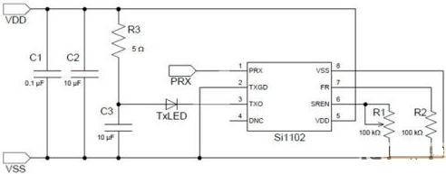 Si1102是一个可独立工作的红外接近传感器,能驱动单个红外LED。LED发射的红外线经过接近物体反射到达内置的红外线光电二极管,然后进行信号放大和信号处理,最后通过与一个设定的探测门限值比较输出一个相应逻辑电平。如果测量的结果高于这个门限值,则从PRX口输出一个低电平。这种电平信号的输出可用来作为其他器件的驱动或者MCU的中断输入,进而实现近距探测。