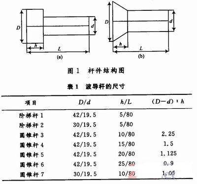 为了研究不同结构形状的导波杆对声发射信号的放大情况,采集经过不同结构的导波杆信号,利用能量、最大振幅二个参数研究其放大规律。所以设计了一系列不同结构的杆来研究其放大规律。如图1所示,(a)为阶梯形杆,(b)为圆锥形杆,尺寸见表1。
