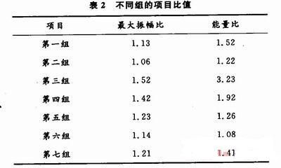 由第一组和第二组数据分析,对面积比α=0.46阶梯杆1和面积比α=0.65阶梯杆2,随着面积比α的增加,最大振幅比和能量比都减小,符合位移透射系数M=2/(1+α)随α增加而减小的性质。对圆锥杆3~6,其大小端面积相同,α为定值,由第三组至第六组数据可知,随着锥度的减小,其最大振幅比和能量比都减小。其原因在于这里的假设是完全弹性体,没有能量的损失,而实际金属介质并非完全弹性体,除了弹性外还有粘性和塑形,内部还有少量杂质和缺陷,这些都会引起能量的损耗。设单位体积的能量损耗一定,对圆锥杆而言,锥度愈小,其体积愈大,波在其传播时,损耗也愈大。这就解释了相同面积比,不同锥度的圆锥杆对信号的放大情况不同。从第一、三、四组数据可以看出,相同面积比的阶梯杆1和圆锥杆3,4,圆锥杆的最大振幅比和能量比都比阶梯杆1的大些。比较第三组和第七组数据,杆3和杆7为相同的高度和小端面积,但杆3的大端面积比杆7大,其最大振幅和能量比也比杆7大。