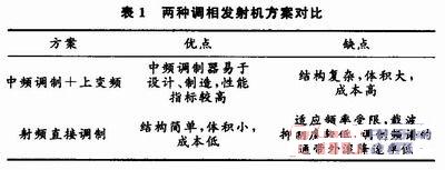 发射机调制方式常用中频调制和射频直接调制2种方式。中频调制是在较低的中频上进行调制后,再通过混频等频率变换,把该中频信号搬移到需要的发射载波频率上去。对射频的直接调制是在需要发射的射频频率上进行的,直接把基带信号调制到射频载波频率上,没有变频环节。两种调制方式各有优缺点,主要对比见表1。
