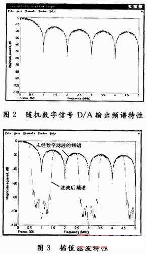 符号速率为1 MHz的随机序列频谱如图2所示。对信号进行滤波可以对边带信号进行抑制,减小带宽的占用。如果采用模拟滤波则需要的滤波器阶数很高,这会增大滤波器的体积,降低环境的稳定性。采用数字滤波技术可以很方便地实现高阶滤波,对近端带外信号进行抑制,降低对模拟滤波器的要求。本方案采用的数字接口电路是具有2倍采样43阶FIR的低通插值滤波电路,相当于增加了滤波器,阻带抑制达到62 dB,因此调制输出的信号频谱特性得到了很大改善,通带外的近端频谱得到了很大抑制,对于高于转换时钟的频率,其滤波特性的周期性折叠。图3为经过插值数字滤波后的频谱与原频谱的对比,数字插值滤波电路的阻带抑制使模拟滤波器有较宽的过渡带,电路要求得以降低。