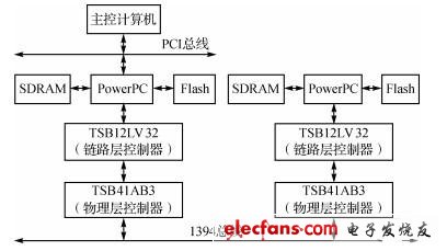 主控计算机上的1394节点采用PowerPC作为通信和数据处理的核心。采用PowerPC的原因是它的体系结构是开放的,而且PowerPC在大数据量、高速信号处理中具有强大的优势和很好的应用潜力。由于大多数PC机上都具有PCI接口,PCI总线应用广泛,PCI接口驱动的通用性较强,所以主控计算机与PowerPC可通过主控计算机上的PCI接口进行通信,这就简化了在主控计算机上开发PCI接口驱动的工作。而IEEE 1394接口采用双接口芯片设计,并配备了SDRAM作为大容量数据缓冲,用Flash来存放软件。1394节点都是通过1394总线连接的。主控计算机上的1394节点(已设为根节点)通过1394总线与网络中其他某个设备上的1394节点(已设为叶节点)相连的整体框图如图2所示。左侧为根节点架构,右侧为叶节点架构。叶节点的架构与根节点的架构是类似的,但由于只有根节点与主控计算机连接,而叶节点不与主控计算机相连,所以叶节点并不需要PCI总线。