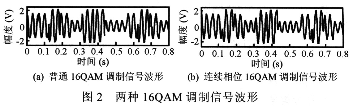 用TEKTRONIX2221A型数字存储式示波器观测实验结果,图10(b)是输出的连续相位16QAM调制信号波形,为了便于比较,图10(a)中给 出普通16QAM调制在相同条件下的输出波形,从图10中可以看出两种调制信号仅在相邻码元之间的过渡区有所不同,普通16QAM调制信号存在的尖锐跳变 在连续相位16QAM中则相对平缓得多,而在过渡区结束后,进入每一个码元的主要部分时两种调制的波形是一致的。