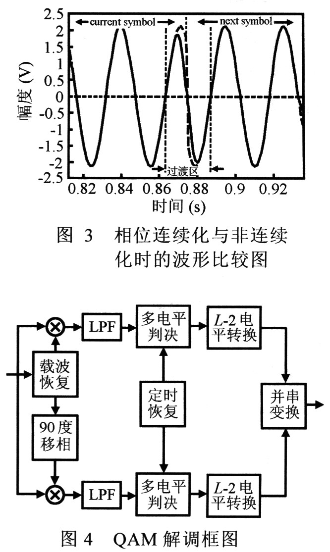 称 为连续化函数,2τ称为过渡区宽度,而把一个码元的其它部分称为该码元的主要部分。之所以选用这样的连续化函数,是因为考虑到sin函数取值在一l和+1 之间,并且是相当平滑的,这样S(t)的取值范围是[0,1],于是运用公式(5)和(6)正好可以使相位在过渡区2τ内完成△θ的变化量,即从θm到 θm+1的变化是在过渡区内逐渐完成的,这不同于一般QAM调制的相位跳变。在过渡区结束后,即进入一个码元的主要部分时相位已经达到与输入数据相对应的 相位值θm+1。这种变化既满足了QAM调制相位转移的要求,又实现了用相位连续变化代替跳变的目的。