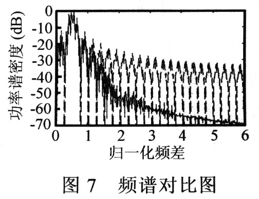 为了研究连续相位技术对QAM调制性能的影响,利用计算机进行了模拟仿真实验。图7是普通16QAM调制和连续相位16QAM调制的频谱对比图(过渡区宽 度选为1/4个码元周期)。图中横轴表示归一化频差(f一fc)Tb,纵轴表示功率谱密度。图7中虚线表示普通QAM调制的单边功率谱,实线表示连续相位 QAM调制的单边功率谱。对比图中各谐波分量,除主峰和第l谐波峰不变外,第2、3、4峰分别下降了1.27dB、8.19dB和15.7dB,从第5峰 开始均下降20dB以上;从整体上比较,两者的平均功率在2:1左右。由于有用信息主要存在于主峰及其附近区域,现在主峰和第1谐波峰与普通QAM调制时 一样,这就说明相位连续技术在压缩频带的同时,有用信息不会因此而丢失。