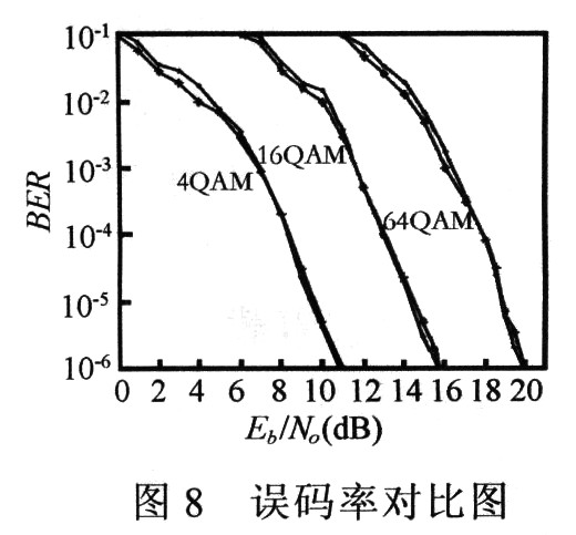 由于在过渡区依据连续函数S(t)进行变化,所以经过相位连续化处理后的信号相对于普通QAM调制信号在波形上存在一定程度的“失真”。为了确定这种改变 对QAM调制传送信息数据可靠性的影响,利用蒙特卡罗仿真方法产生了连续相位QAM调制在高斯噪声信道下的误码率曲线,如图8中点线所示。为了便于对比, 图8中还绘出了在同样条件下普通QAM调制的误码率仿真曲线(如图中带*线所示)。对比两条曲线可以看出,在低信噪比时,连续相位QAM的误码性能要略差 于普通QAM,但相差很小;在高信噪比时,两条曲线几乎重合。这是由于仅在过渡区对QAM调制进行连续化处理,码元的主要区间内相位没有受影响,而在解调 时,判决又选择码元的主要区间,所以采用连续相位技术后QAM调制的抗噪性能与普通QAM调制几乎一致。