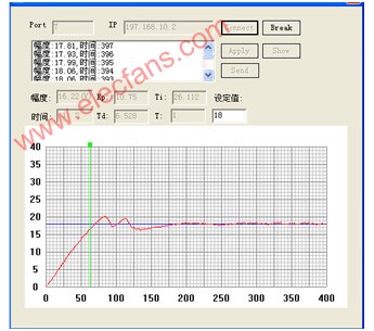 本文设计完成的基于以太网的远程液位继电自整定PID控制系统,其控制算法在远端主机(客户机)上实现,两端通过TCP协议通信,本地的嵌入式系统 (服务器)上一方面实现对网络数据的处理,一方面完成对液位高度的采集与控制;远端PC机上一方面处理网络上的实时数据,一方面通过PID计算出控制量,显示相关参数。实时液位变化状况如图2所示,从图中可以看出,实际液位(红色曲线)能够稳定在液位设定值(蓝色曲线)处。同时,从用户界面上既可以读出液位高度值,PID自整定参数等,还可以改变液位高度设定值,从而真正实现了液位对象的远程监控。