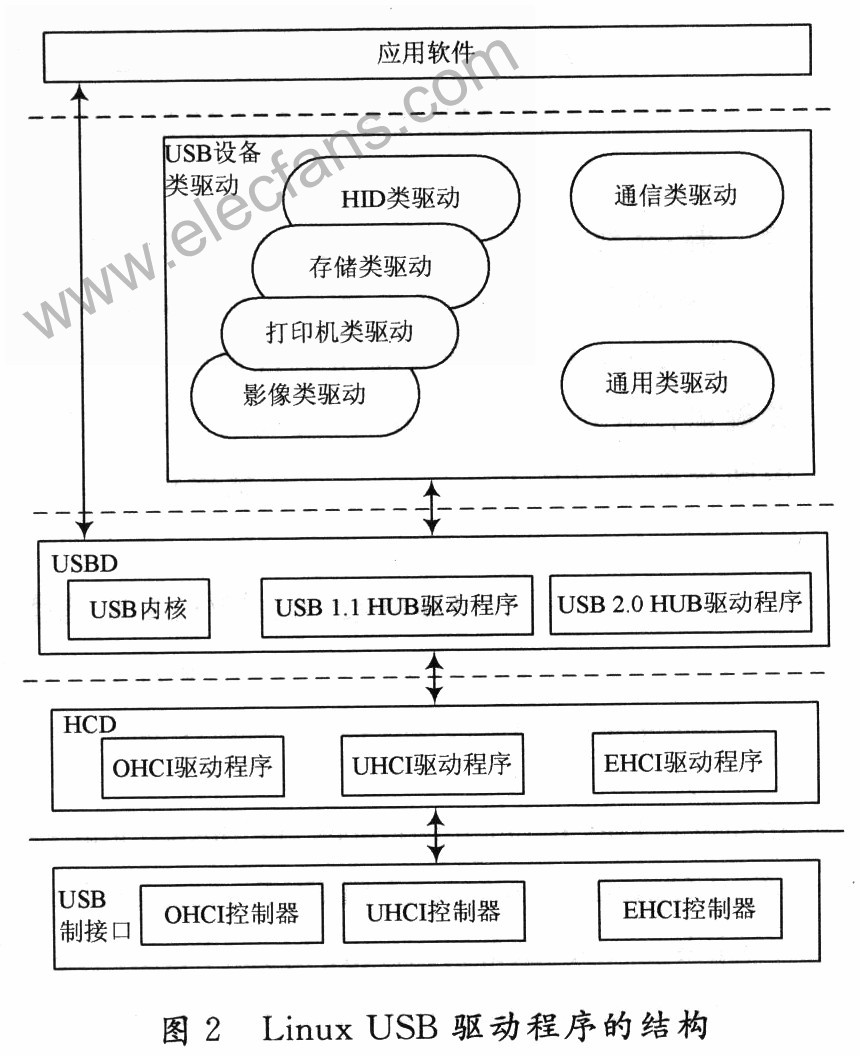 由于USB接口为主从方式和多设备连接的树状网络结构,所以USB主机必须具备对所有连接在总线上不同类型的USB设备进行配置管理的功能。LinuxUSB主机驱动程序可以同时支持多路USB总线功能,每路USB总线独立工作。USB主机驱动由USB主机控制器驱动(HCD),USB驱动(USBD)和不同的USB设备类型驱动三部分组成。图2描述了Linux USB驱动程序的结构。Linux定义了通用请求块(UniversalReqlaest Block,URB),用来在USB设备类驱动程序与USBD,USBD与HCD间进行数据传输。