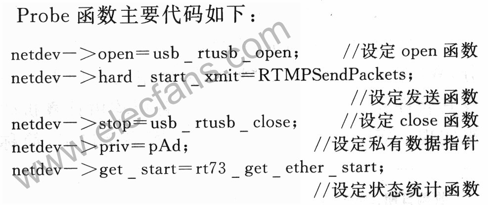 当无线网卡插入USB总线时,USB core就会调用Probe方法来检测被传递进来的信息,以确定无线网卡设备是不是与驱动程序匹配,同时填充struct net_device完成对该网络设备的初始化。当无线网卡被拔出时,USB core就会调用Disconnect方法来完成清除工作。驱动程序通过显示模块的初始化和消除函数注册与注销模块调用module_init来初始化一个模块,并在卸载时调用moduel_exit函数。