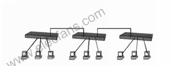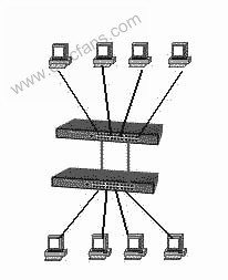 这是最常用的一种组网方式,它通过交换机上的级联口(UpLink)进行连接。需要注意的是交换机不能无限制级联,超过一定数量的交换机进行级联,最终会引起广播风暴,导致网络性能严重下降。其结构示意图如下所示。