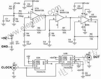 需根据具体应用选择运算放大器、比较器和D触发器,运算放大器U1A、U1B的带宽应达到用户期望的最高输出信号频率(在本例中,MAX1428增益带宽积达到25MHz)。该运放的稳定增益大于或等于10倍,但对现在的应用来说,稳定性已不是主要关注的问题。为得到合理量级的随机数,比较器的传输延时应能达到所期望的最小比特率周期的水平(太大的传输时延可能会造成N-1、N、N+1之间的某一位丢失)。MAX961是一个好的选择,其传输时延只有4.5ns。触发器需提供快速的上升时间和干净的边沿,以及尽量小或没有过冲。可选择74HVC74,以保持与运放和比较器相同的工作电压范围:2.7V-5.5V。74HVC74的工作电压范围可达2V-5.5V,最小开关频率可达80MHz(3V供电)。