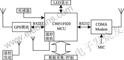 移动终端的硬件部分主要有CDMA Modem模块、GPS模块、MCU及电源四部分,连接关系如图2所示。