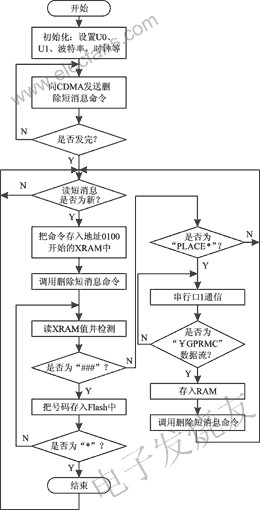 两个不同命令短信的执行,功能子程序是分开的,但前端的判断跳转程序是关联的,所以将两个程序合在一起讨论。该程序包含对两个串口同时操作,先读新消息。如果内容有“PLACE*”,则进入定位信号的提取。判断是否有“###”,有则进入存储号码的功能。